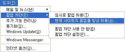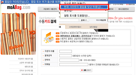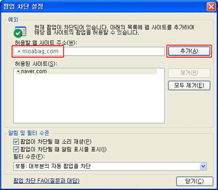 [기타안내]윈도우 XP 팝업차단 해제 방법 현재 모아백에 접속하신 상태일때 익스플로러 > 도구 > 팝업차단> 현재 사이트의 팝업을 항상 허용(A)을 선택하세요. 접속하신 상태에서 팝업 차단 메시지가 주소창 아래에 나올때 아래 그림처럼 상태줄을 클릭하신 후, 현재 사이트의 팝업을 항상 허용(A)을 선택하세요. 추가된 내용을 확인하신 후엔 닫기 버튼을 눌러주세요. 접속하지 않으신 상태이거나, 이미 차단 되었을때